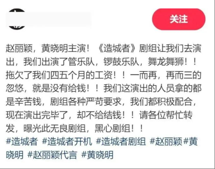 赵丽颖、黄晓明领衔的《造城者》剧组,竟被曝拖欠群演工资长达四月,活脱脱现实版“造城容易造薪难”。